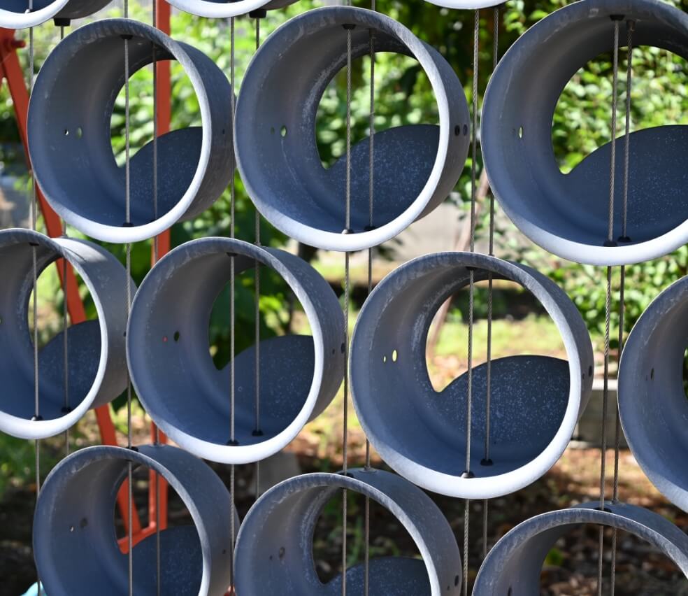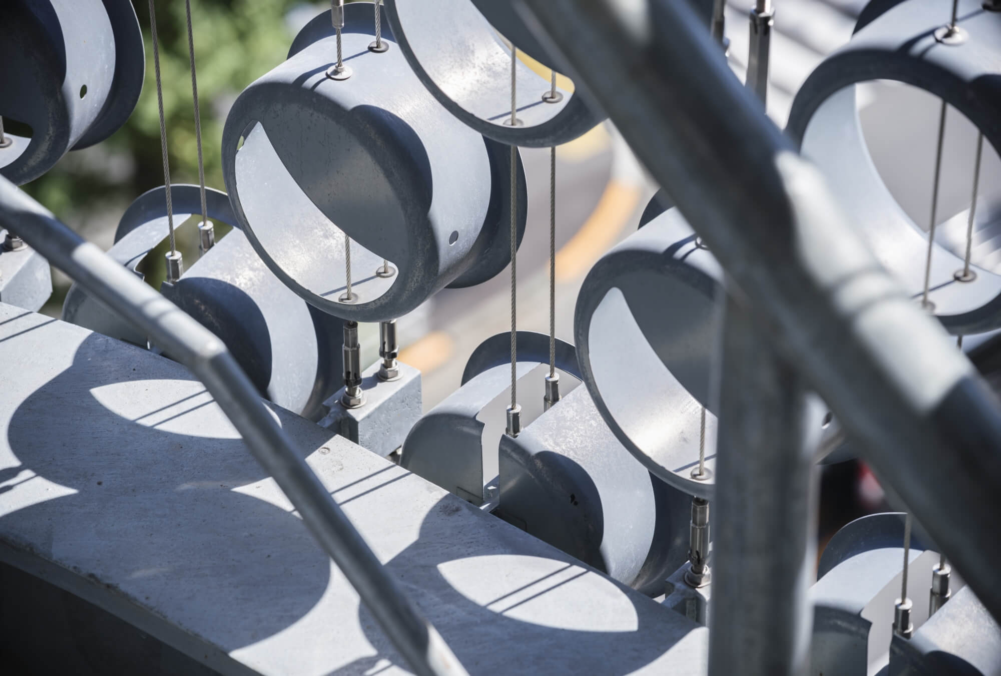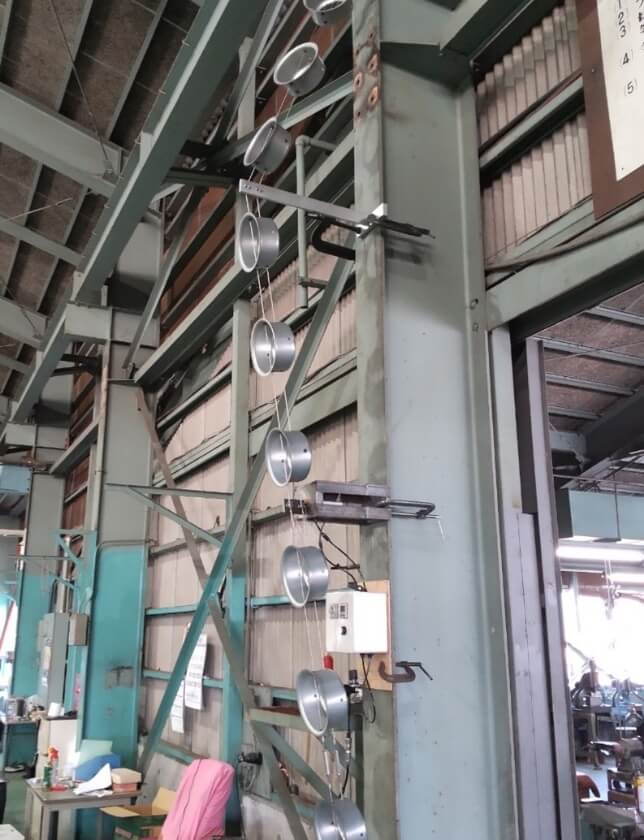 この部材は「なべ底形状」と呼ばれる凹型で、金属加工のノウハウを活かし、精度高く仕上げています。また、ワイヤー接続部の金具なども含め、かしめ加工や部品製造、組立までを自社で一貫対応しており、設計意図に即した品質と施工性を確保しています。