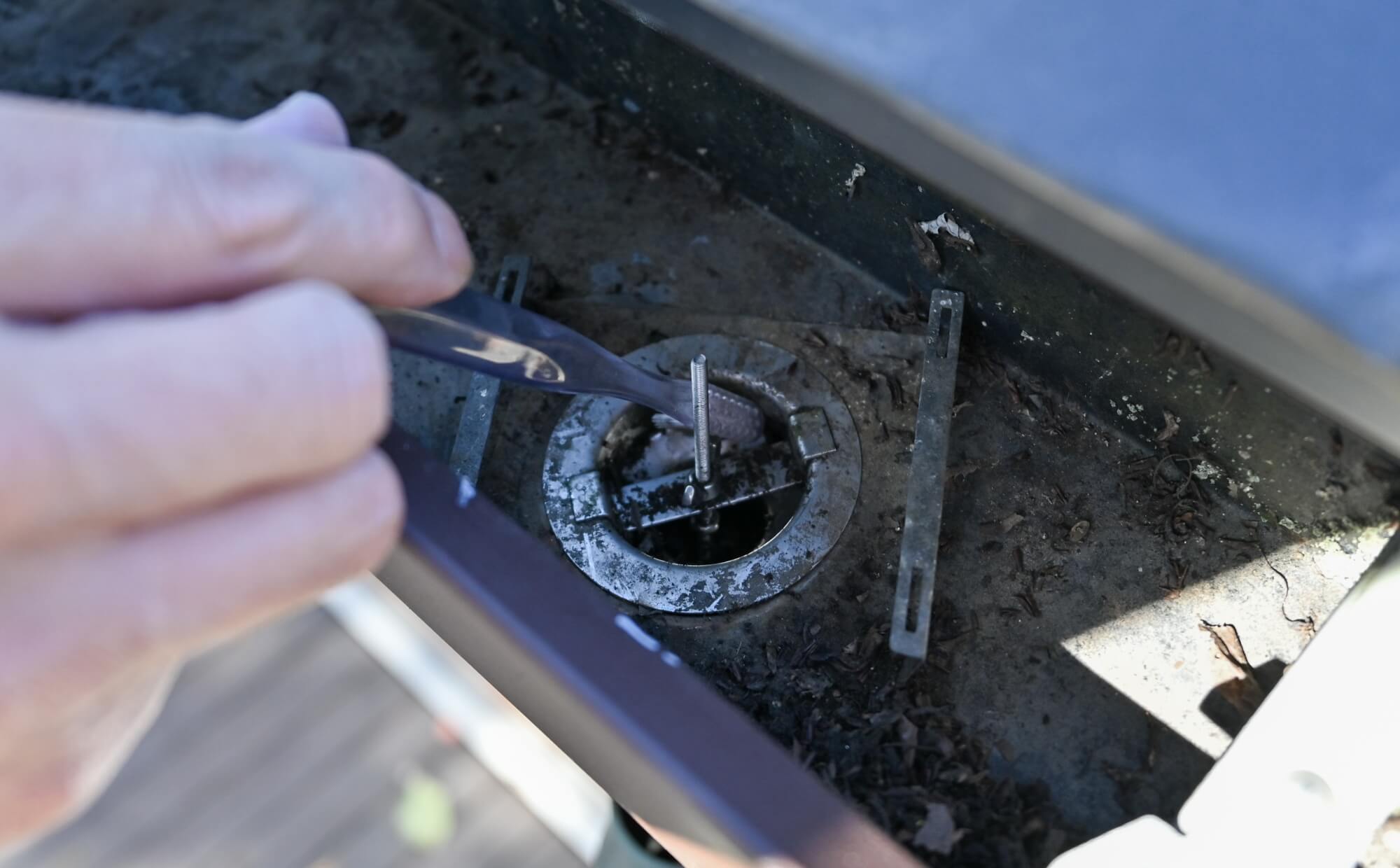 最初に確認すべきポイントは、横樋から鎖樋へつながる「集水器」です。ここは落ち葉や泥がもっともたまりやすく、詰まりが発生すると雨水が正常に流れなくなる原因となります。落ち葉・細い枝・泥や砂・雨風で飛んできたゴミなどが溜まりやすいため、手やブラシ、細い棒などを使って無理のない範囲で取り除いてください。落葉が多い季節は短い間隔での確認がおすすめです。集水器が詰まった状態では鎖樋本体を掃除しても水はきれいに流れません。水の流れが悪いと感じた際は、まずここを確認するのが最も確実です。
