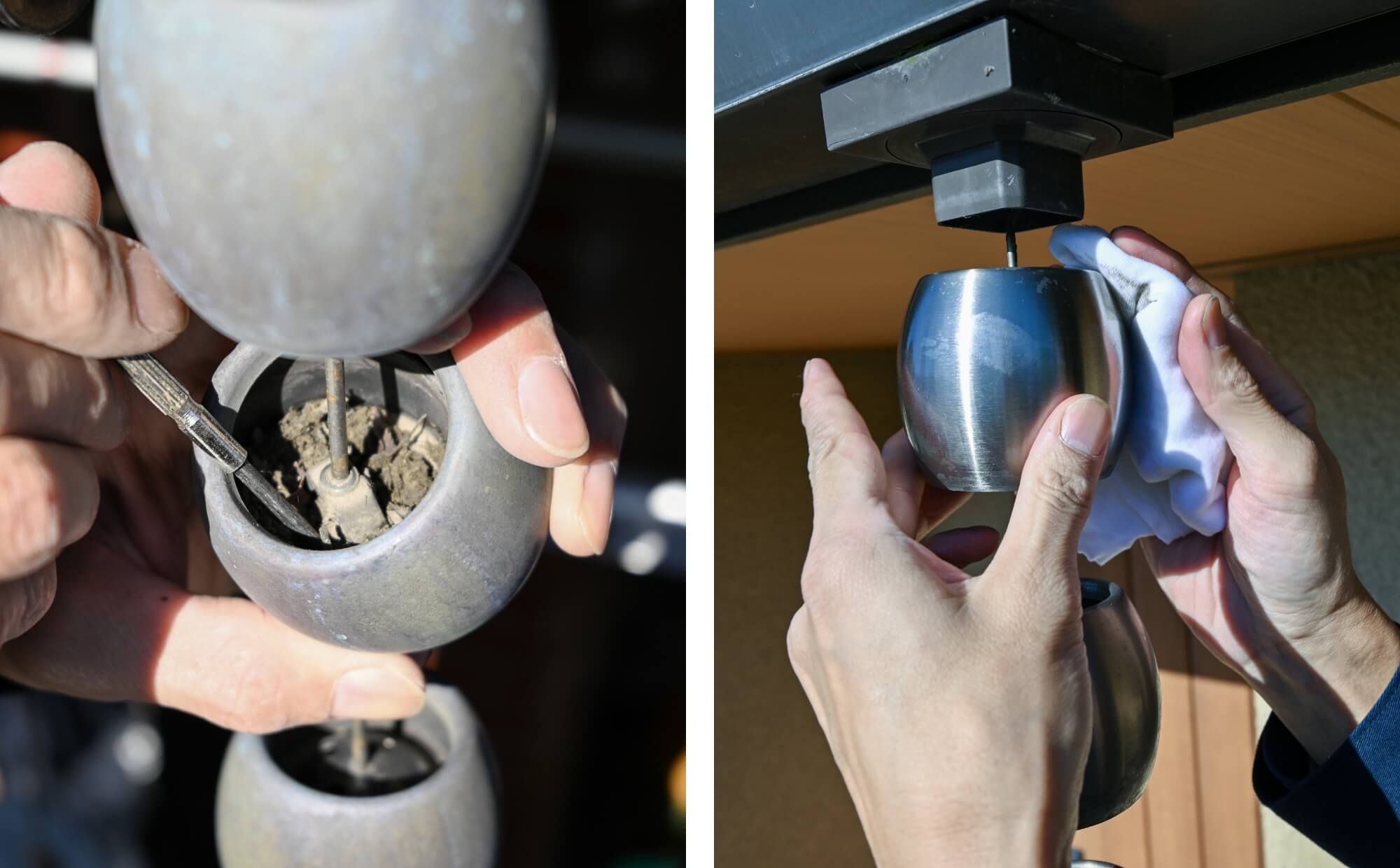 集水器の掃除が終わったら、次に鎖樋本体を確認します。鎖樋の中子(内部)には落ち葉や泥が入り込むことがあり、水が途中でせき止められる原因になります。詰まりが見える場合は細い棒やブラシなどを用いて、無理のない範囲で押し出してください。外側の軽い汚れは、表面を軽くふき取ると見た目をよりきれいに保つことができます。気になる場合はぬれた布で優しくふき取ってください。(銅の鎖樋はふき取り不要です)