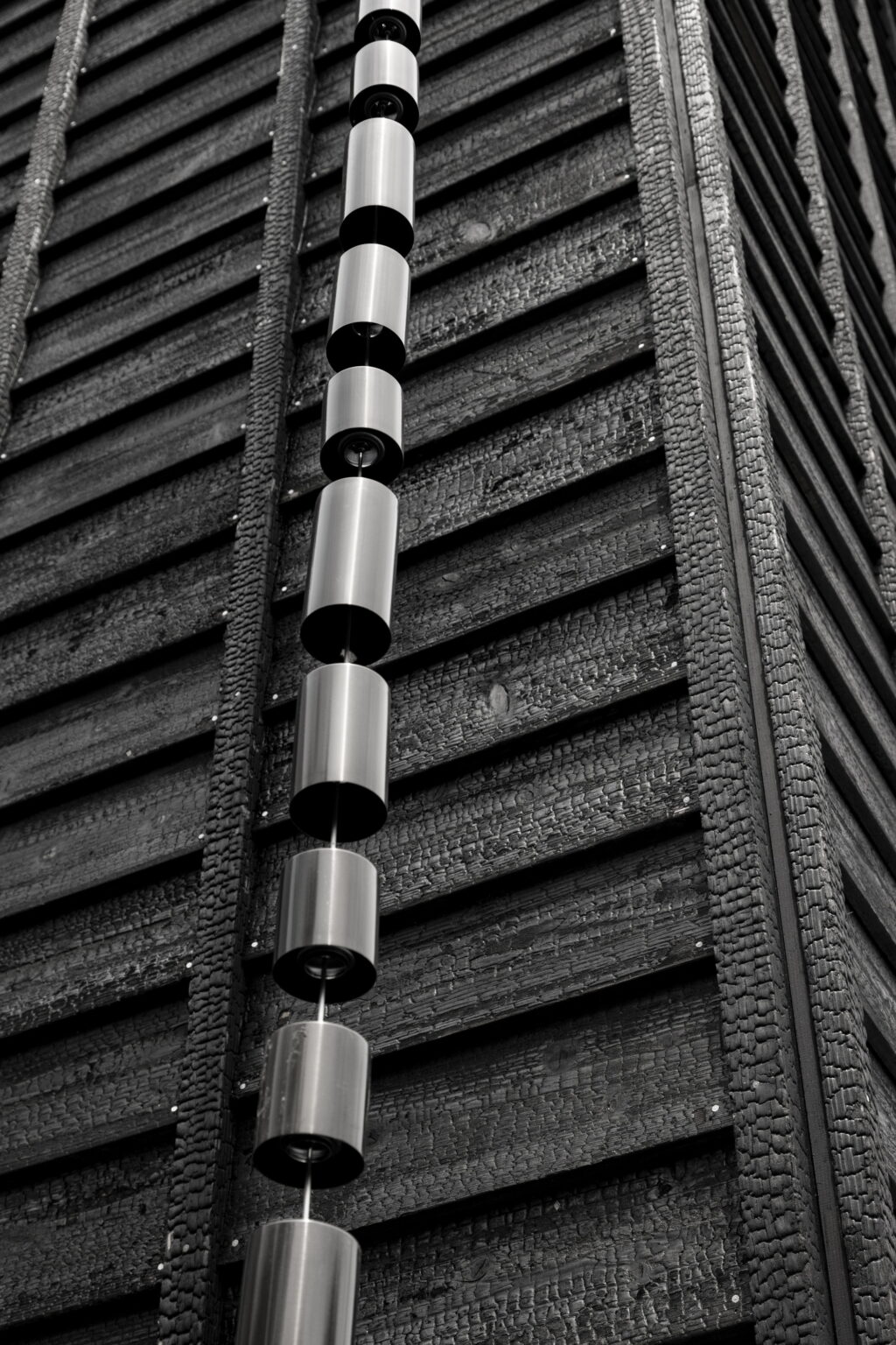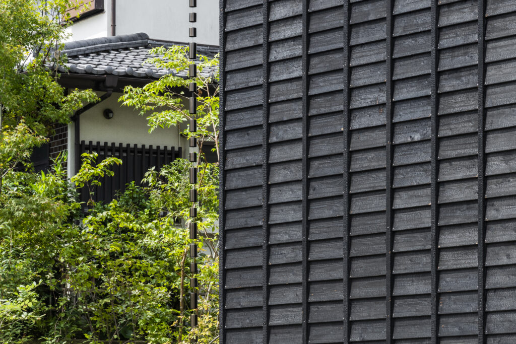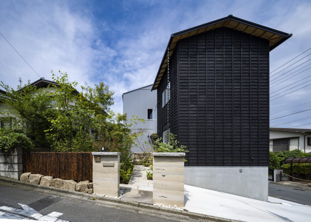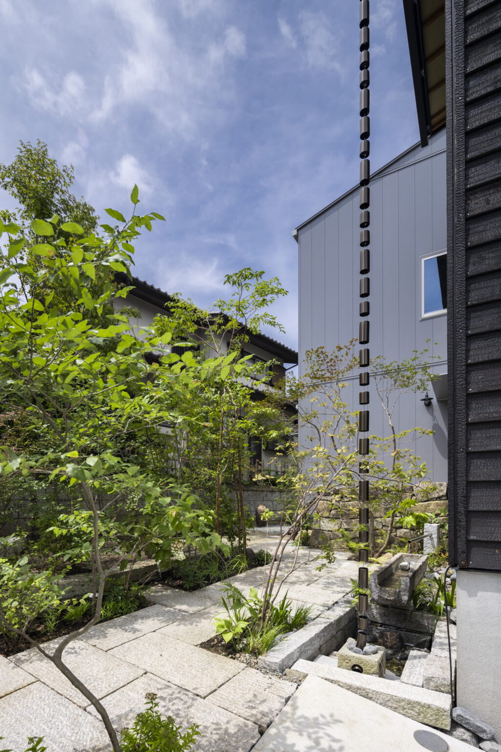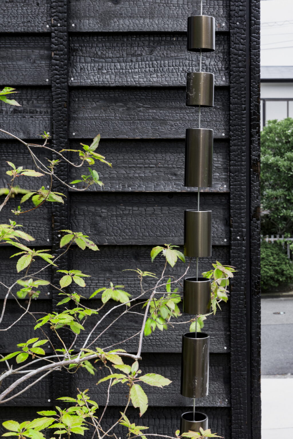 OZONEのモニター企画にて、当社が選定した個人邸宅に〈筒L ブラック〉の鎖樋をご採用いただきました。 焼杉の羽目板張りが印象的な、静かな佇まいの住まいです。 鎖樋は門扉のすぐ裏に設置され、水盤へと雨水を導く構成となっています。